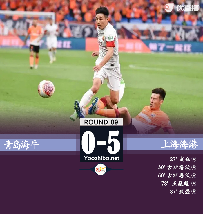 来源:直播车05-01 20:24 直播车讯:北京时间5月1日18:00,中超第9轮继续进行,青岛海牛坐镇主场青岛青春足球场迎战上海海港,本场主裁判为王巍,VAR裁判为马宁。上半场,武磊传射建功,古斯塔沃破门,巴尔加斯献助攻,随后古斯塔沃与奥斯卡进球被吹。下半场,古斯塔沃与武磊各再入一球双双梅开二度,王燊超建功。最终,海港客场5-0大胜海牛。