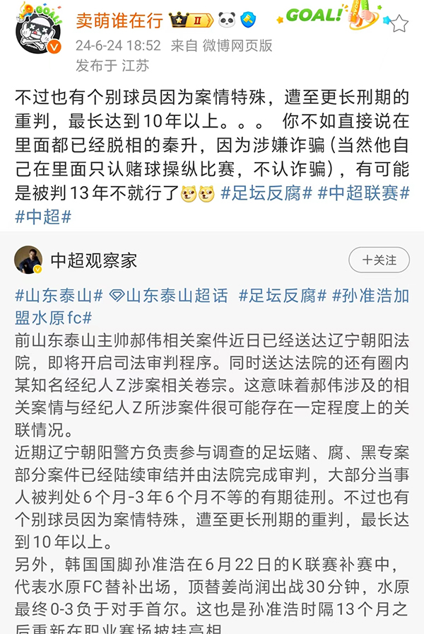 在球迷关注的时候,另一个足球媒体人“卖萌谁在行”也是接力爆料,该媒体人表示“你不如直接说在里面已经脱相的秦升,因为涉嫌ZP(当然他自己在里面只认假球和操纵比赛,不认ZP),有可能被骗13年不就行了。”好家伙,原来有可能被判13年的大鱼是前国脚秦升,随后全网首个曝出李铁被抓的媒体人“李平康”也是现身,李平康表示在社交媒体上爆料:人为财死鸟为食亡,秦升本来跑得最早,赛季没结束就消失了。结果后来通知补发工资,竟然真就回来了,领工资被抓也是一段传奇了。