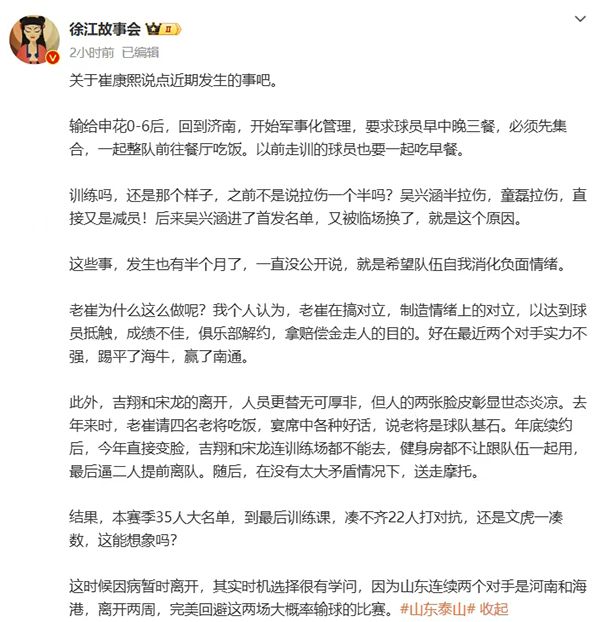徐江也是强调,崔康熙这一次离开的时机和选择还是很有学问的,因为山东接下来的对手是河南和海港,离开两周以后,完美回避两场大概率输球的比赛。随后,徐江也是强调:崔康熙的离开是避开海港和河南,对于山东鲁能,崔康熙现在想要做的是拿赔偿金走了。