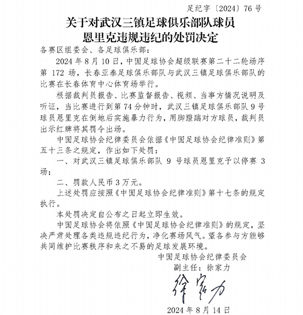 此外,足协还宣布,长春亚泰的外援祖伊被禁赛3场罚款3万元人民币,武汉三镇的外援恩里克则被追加禁赛3场罚款3万元人民币,2人当时都是出现暴力行为被红牌罚下。足协的处罚决定表示祖伊在实施暴力行为,用脚踩踏恩里克腹部;恩里克也实施了暴力行为,倒地后用脚蹬踏祖伊。最终,足协的罚单也是“各打五十大板”。