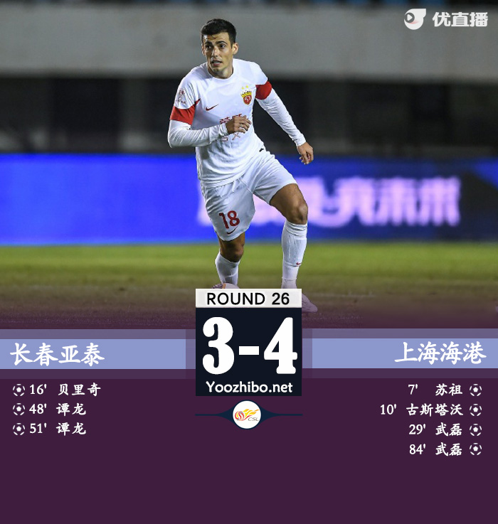 第7分钟,海港右侧传中到禁区,苏祖抢到第一点解围不远,外围茹萨得球再打门,门前苏祖解围失误不慎自摆乌龙,海港客场1-0领先