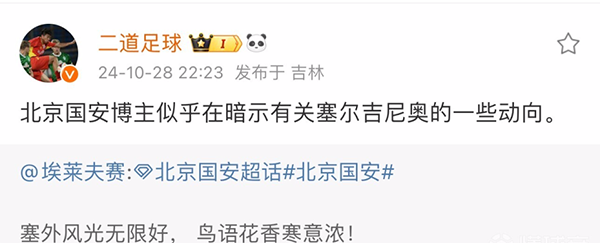来源:直播车10-30 15:53直播车讯北京时间10月29日,国安资讯博主“埃莱夫赛”更新动态,若有所指写道:“塞外风光无限好,鸟语花香寒意浓!”随后,亚泰资讯博主“二道足球”转发了该动态并写道:“北京国安博主似乎在暗示有关塞尔吉尼奥的一些动向。”
