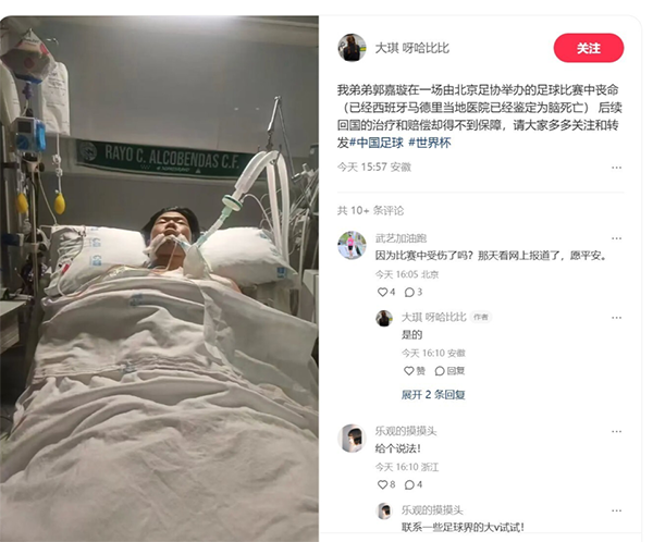 来源:直播车02-11 18:14直播车讯 北京时间2月11日,北京国安俱乐部U19梯队队员郭嘉璇的亲哥哥在社媒发声透露,自己的弟弟在代表北京全运队去西班牙马德里集训时。不慎重伤被马德里当地医院鉴定为脑死亡,后续回国的治疗和赔偿却得不到保障。