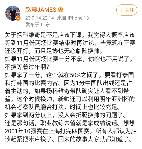 近期,名记赵震也是回应了扬科维奇下课的问题,赵震表示现在并不是扬科维奇下课的时候,扬科维奇当下还有一个很很重要的机会,那就是接下来世界杯预选赛对阵泰国和韩国的比赛,如果韩科维奇在两场比赛1分都拿不到,扬科维奇的下课将成为必然,这也意味着扬科维奇最快的下课时间是在11月。