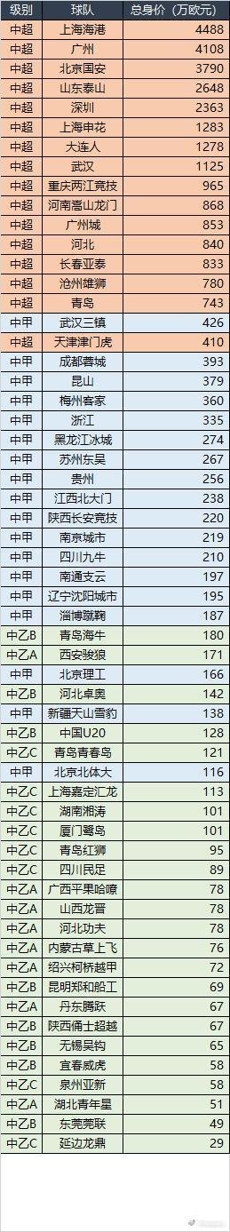直播车讯 根据德转朱艺统计,上海海港以4488万欧元位列中国前三级联赛身价榜头名,广州和北京则分列二三位。
