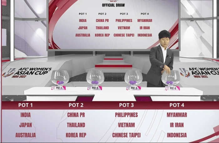抽签仪式开始后,现场先是播放了短片来回放了各支球队之前的精彩表现,接下来是亚足联秘书长发表讲话,接下来是东道主印度的宣传片,将会举办比赛球场情况,印度足协主席发表讲话,能够举办此次赛事很骄傲,印度完全有能力办好本次赛事,接下来进行抽签仪式,东道主印度队自动落入A组。