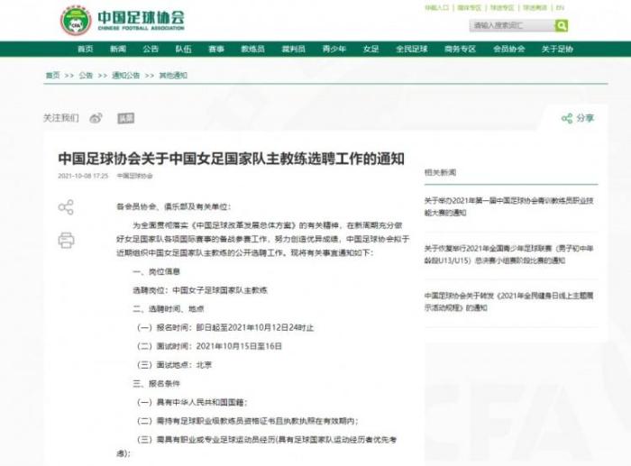来源:直播车10-08 19:52直播车讯 10月8日消息,中国足协官网发布女足国家队主帅招聘信息,应聘者需持有中国国籍,面试时间为本月15日至16日。