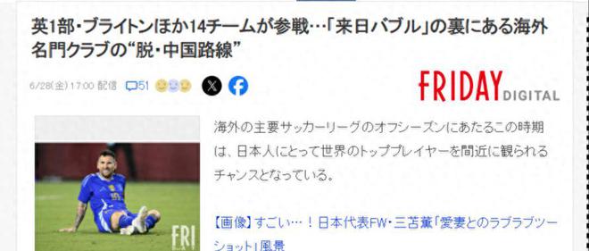 来源:直播车06-29 13:34直播车讯 今夏将有14支球队来到日本进行友谊赛,日媒FRIDAY DIGITAL采访到了一名经纪公司的高层,他谈到了为什么今年欧洲球队不来中国进行比赛。
