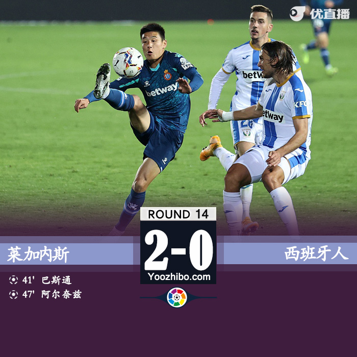 直播车讯:北京时间11月27日2时(西班牙当地时间26日19时),西乙第14轮开始2场较量,西班牙人客场0比2负于莱加内斯,连续3轮不胜,被对方反超跌至第3位。武磊连续5轮担任替补,第66分钟替补出场。恩巴尔巴任意球中楣。巴斯通首开纪录,米格隆两黄下场,阿奈斯再下一城。