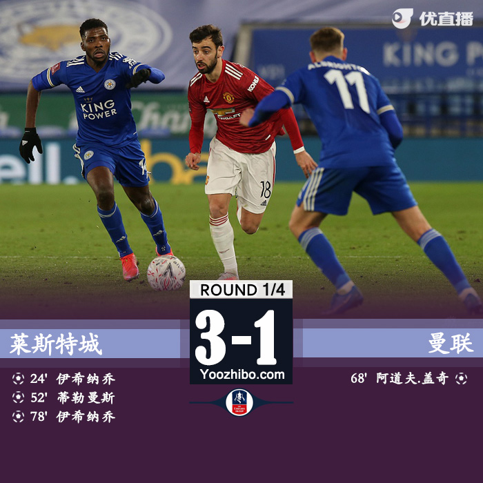 直播车3月22日讯 北京时间3月22日凌晨1点,20-21赛季足总杯1/4决赛,曼联客场挑战莱斯特城。上半时弗雷德回传失误,伊希纳乔笑纳大礼,博格巴助攻格林伍德扳平。下半时蒂莱曼斯一条龙突进破门,伊希纳乔完成梅开二度,瓦尔迪失良机。最终,莱斯特城3-1曼联,莱斯特城晋级足总杯四强,他的对手将是南安普顿。