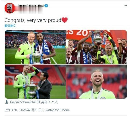 赛后卡斯帕-舒梅切尔的父亲彼得-舒梅切尔在推特上向自己的儿子表示祝贺,他晒出了儿子小舒梅切尔捧杯的照片,并写道:“恭喜,非常非常骄傲!”