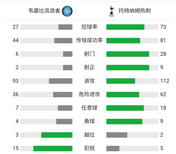 全场比赛结束,韦康比流浪者1-4热刺。
