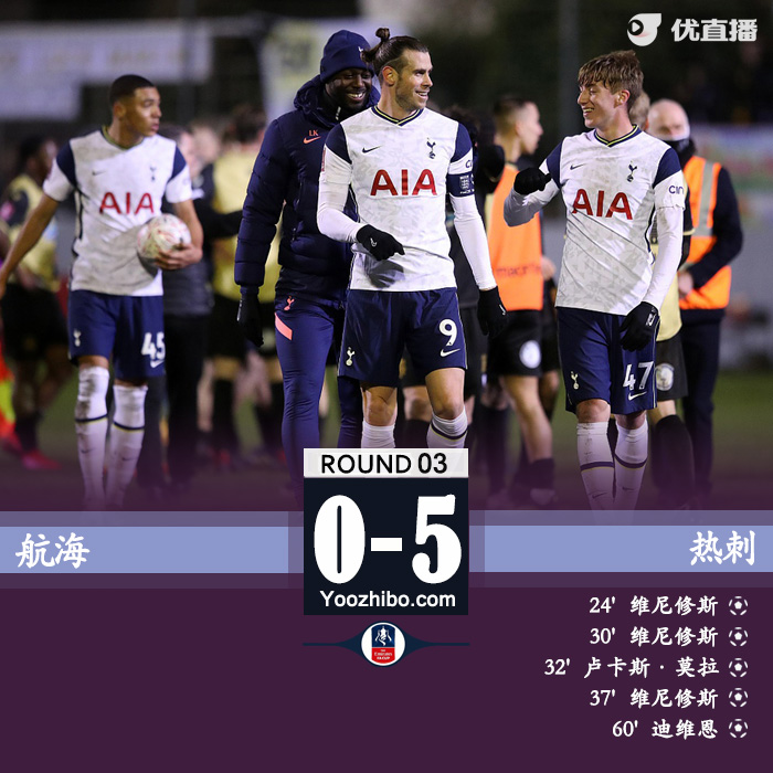 来源:直播车01-11 14:39 直播车讯:北京时间1月11日1:00,英格兰足总杯第3轮,热刺客场挑战航海。上半场,维尼修斯连下两城,小卢卡斯任意球破门,维尼修斯再入一球完成帽子戏法。下半场,16岁小将迪瓦恩抽射近角破门。全场比赛结束,热刺5-0大胜航海,晋级下一轮。