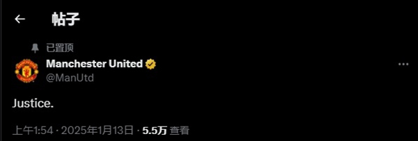 而赛后,曼联官方社媒更新动态,发布“正义(justice)”二字,并且置顶了该条动态。显然,就连曼联官方都被自家球员逆境中爆发的顽强斗志和不屈精神所感动了。